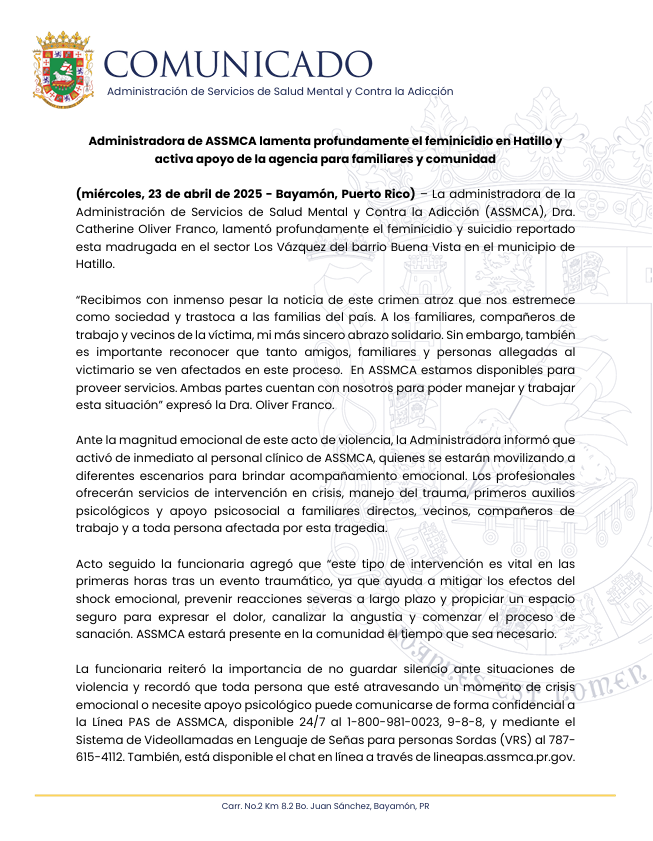 La Dra. Catherine Oliver Franco, Administradora de ASSMCA, expresó su pesar ante el feminicidio y suicidio reportado el 23 de abril de 2025 en el barrio Buena Vista de Hatillo. Extendió su solidaridad tanto a los familiares de la víctima como a los allegados del victimario, asegurando que ASSMCA está disponible para ambas partes.